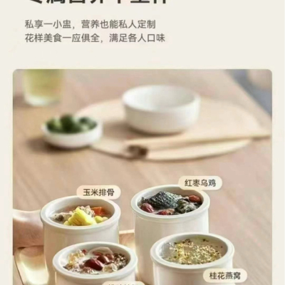现货[福]BECWARE大炖盅,一个2.8L大陶瓷内胆加4个0.8L小陶瓷内胆,带蒸屉,可以上蒸下煮,24小时预约功能,晚上预约,早晨起来就可以吃美味营养丰富早餐啦。七大菜单,精准控温,制作精美食谱,满足全家需求。